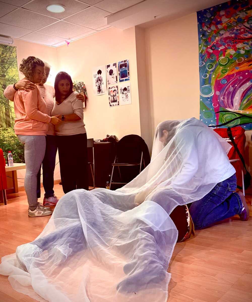 Las sesiones se desarrollan en un espacio de respeto y confidencialidad. Un grupo de representantes está presente al servicio del proceso, sosteniendo el trabajo con presencia consciente.